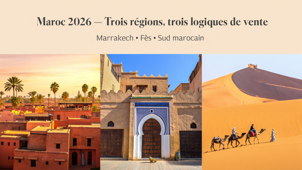 Marrakech, Fès et le Sud marocain ne répondent pas aux mêmes logiques de vente. Pour les agences, l’enjeu n’est pas seulement de choisir une destination, mais de proposer le bon rythme, le bon angle produit et le bon format de GIR selon le profil client.